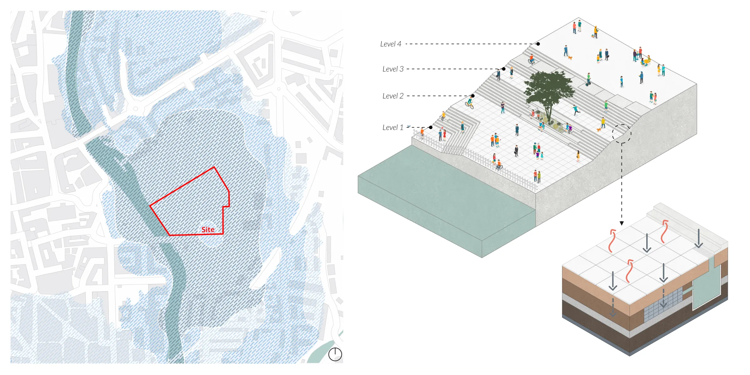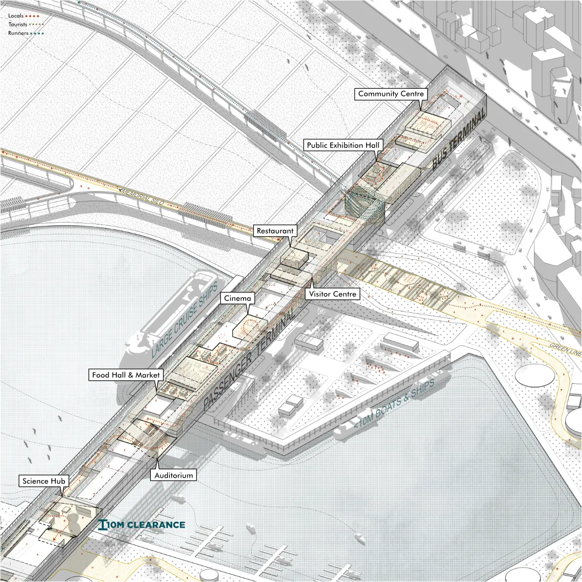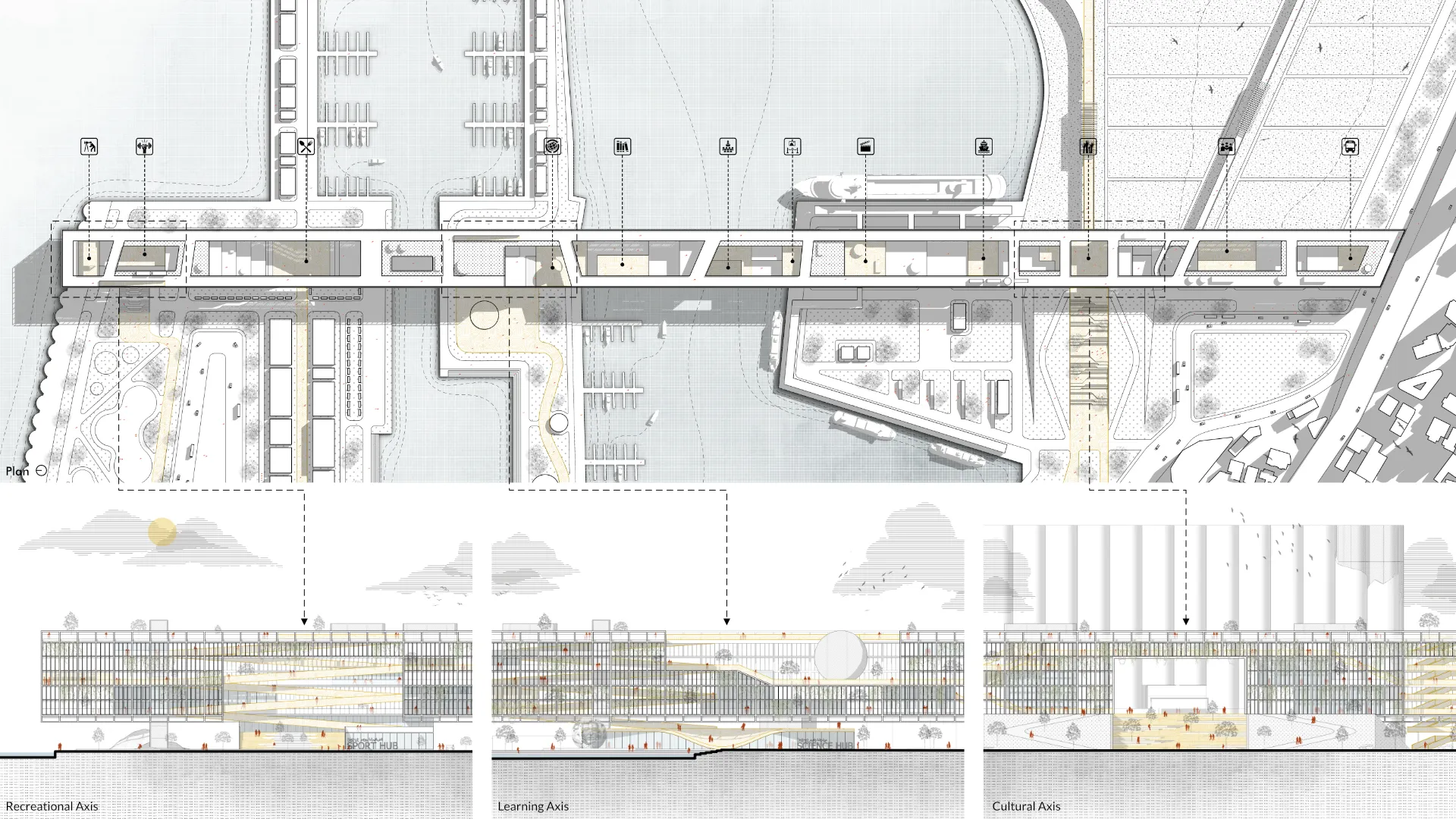 An elevated multi-level public hub accommodates diverse programmes while allowing the brownfield site below to recover through phytoremediation with a sea of sunflowers. Emphasising adaptability and community needs, the project bridges historic divides by providing a flexible framework for the evolving cityscape.