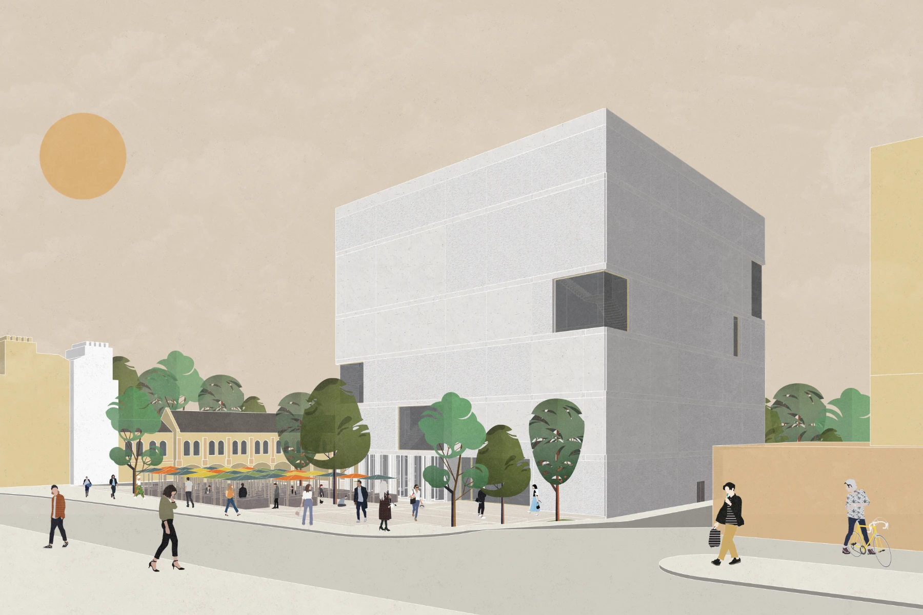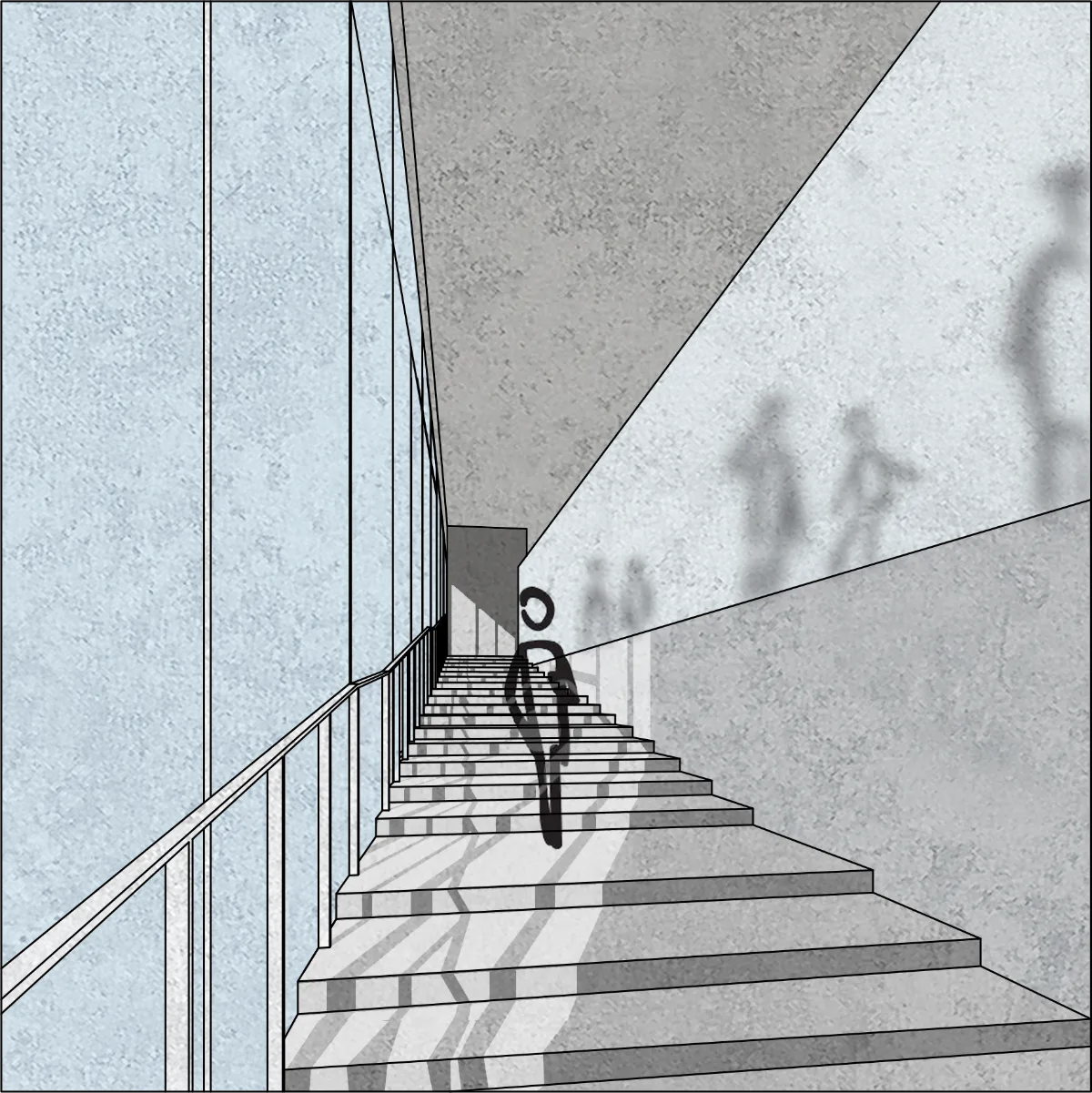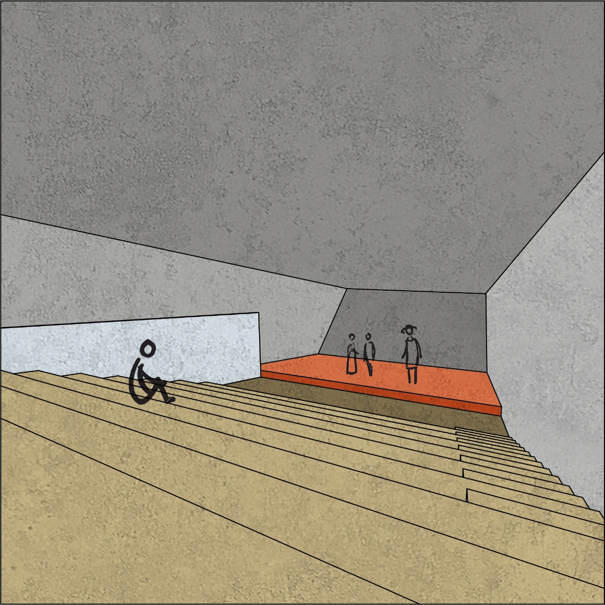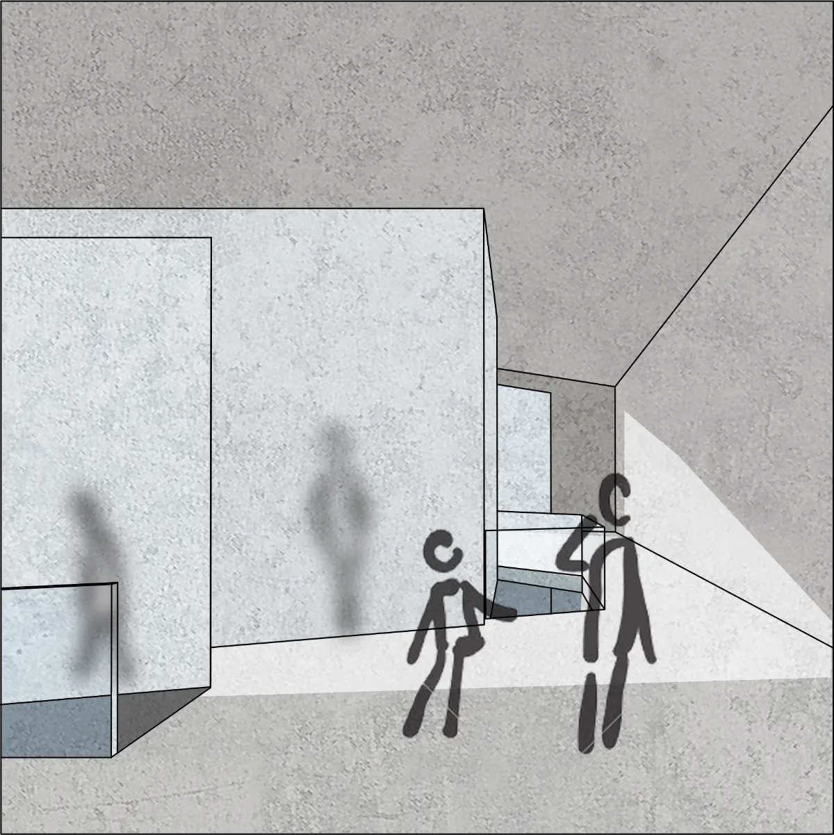 The design challenges the traditional theatre experience, questioning the conventional disconnection between actors and audience. Inspired by the interplay of light, shadow, and materiality throughout the city, visitors engage with seen and unseen presences— their movements casting and revealing shadow-like figures across translucent and reflective surfaces. Interweaving people, space, and history, the theatre creates a living stage where the past lingers, and memory unfolds in motion.