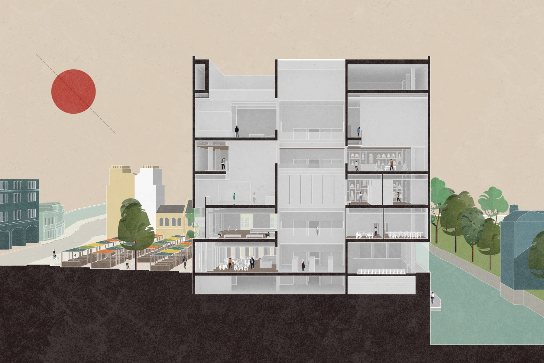 By questioning how people interact with museums and their context, this scheme creates a rich spatial experience which is contained within a singular form, providing a strong urban presence and sense of monumentality.