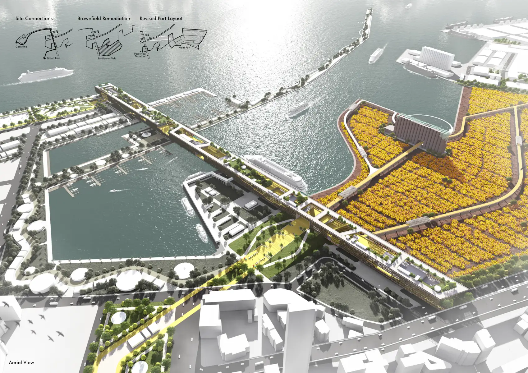 The revised port zone is located at the east end of the plot, while the brownfield remediation site opens up different possibilities for the area. We imagine a public recreational landscape at the central seafront, framed by an urban expansion zone which enables various cultural and commercial uses to promote greater social integration and economic viability.