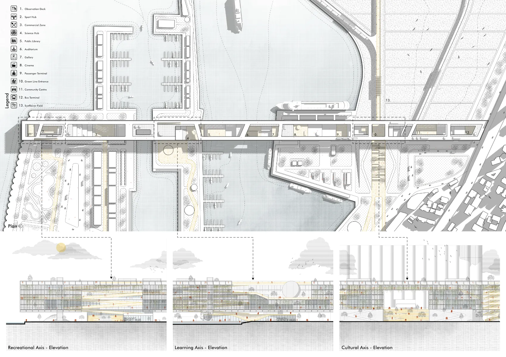 Our design process was iterative and research-driven, moving between sketches, discussions, and conceptual testing. From the start, we focused on the potential connection between the Green Line and the Coastline, exploring ideas of a greenbelt that would weave through the port site. This gradually evolved into a spatial framework cantered around a linear “Elevated Hub,” acting as a platform for community activity and connecting the historic and recreational layers of the city.