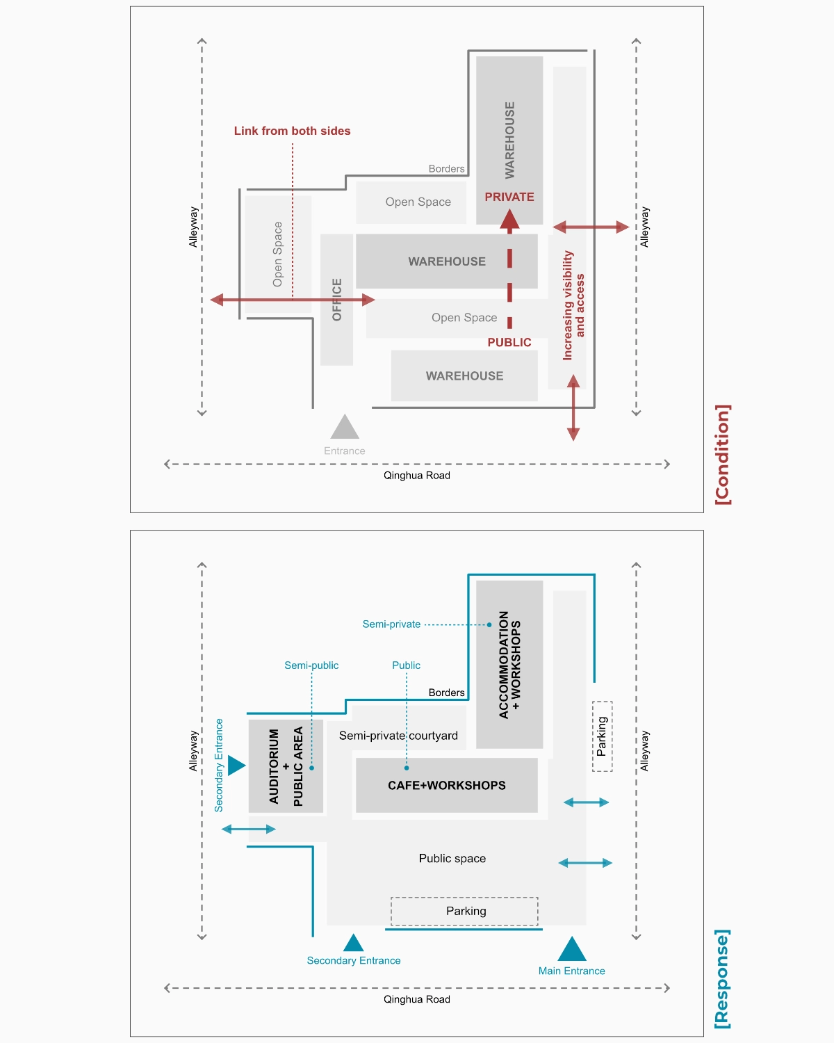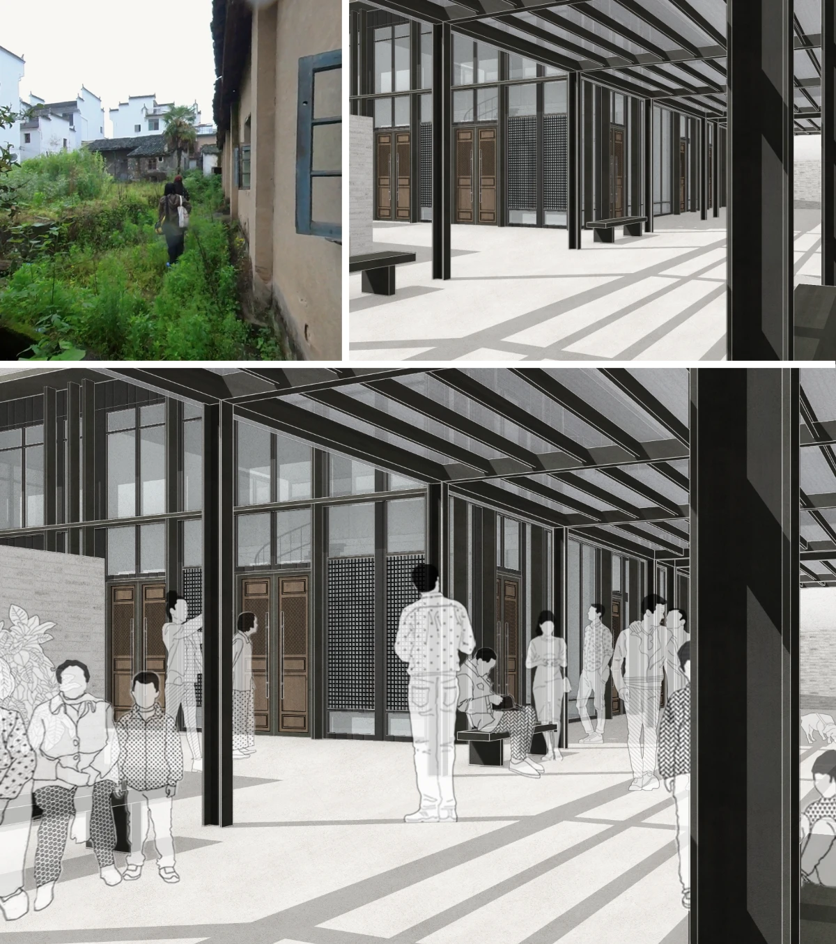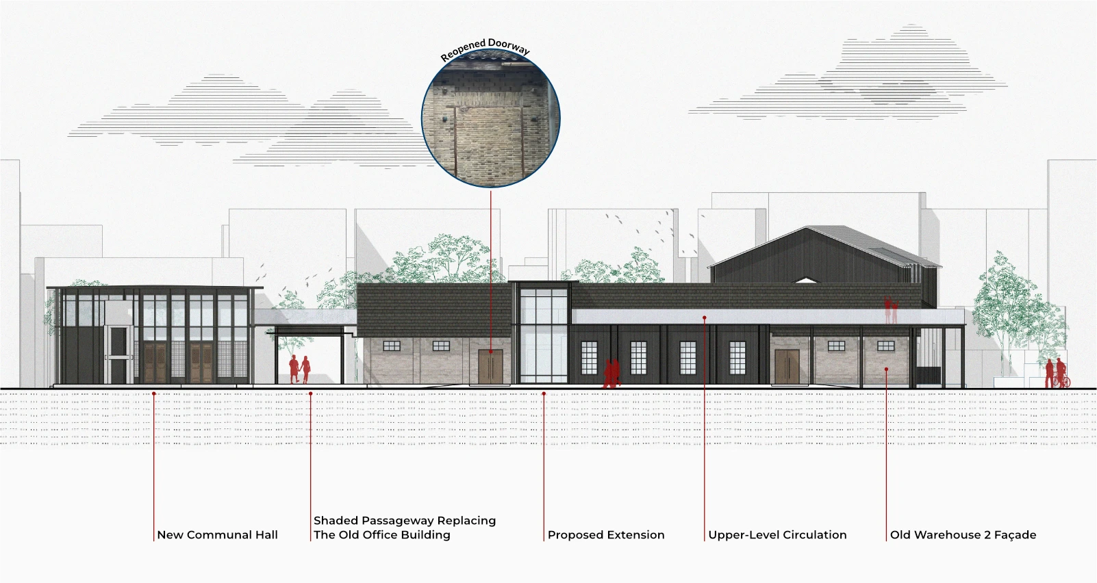 Externally, the new interventions maintain the repetitive, utilitarian rhythm of the existing façades. Situated between the site and traditional Hui-style surroundings, the Communal Hall introduces subtle deviations—patterned panels, reused traditional door leaves, and vertical emphasis—to bridge traditional and industrial expressions.
