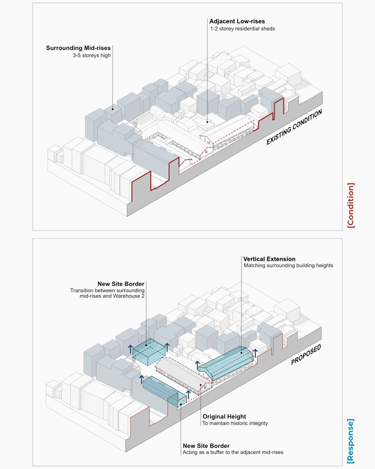 To enhance visibility and strengthen the site’s contextual presence, the massing strategy introduces a vertical extension on Warehouse 3, aligning it with adjacent buildings. A new structure on the western edge, along with targeted modifications to Warehouse 2, further supports a more seamless transition between the site and its urban context.