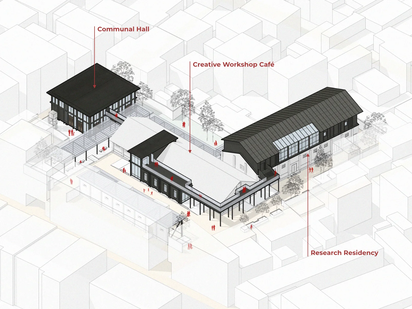 A preceding regional study identified 4 key user groups, shaping a programme centred on a research residency, a creative workshop, and a communal hall—designed to foster interaction and long-term engagement on site.