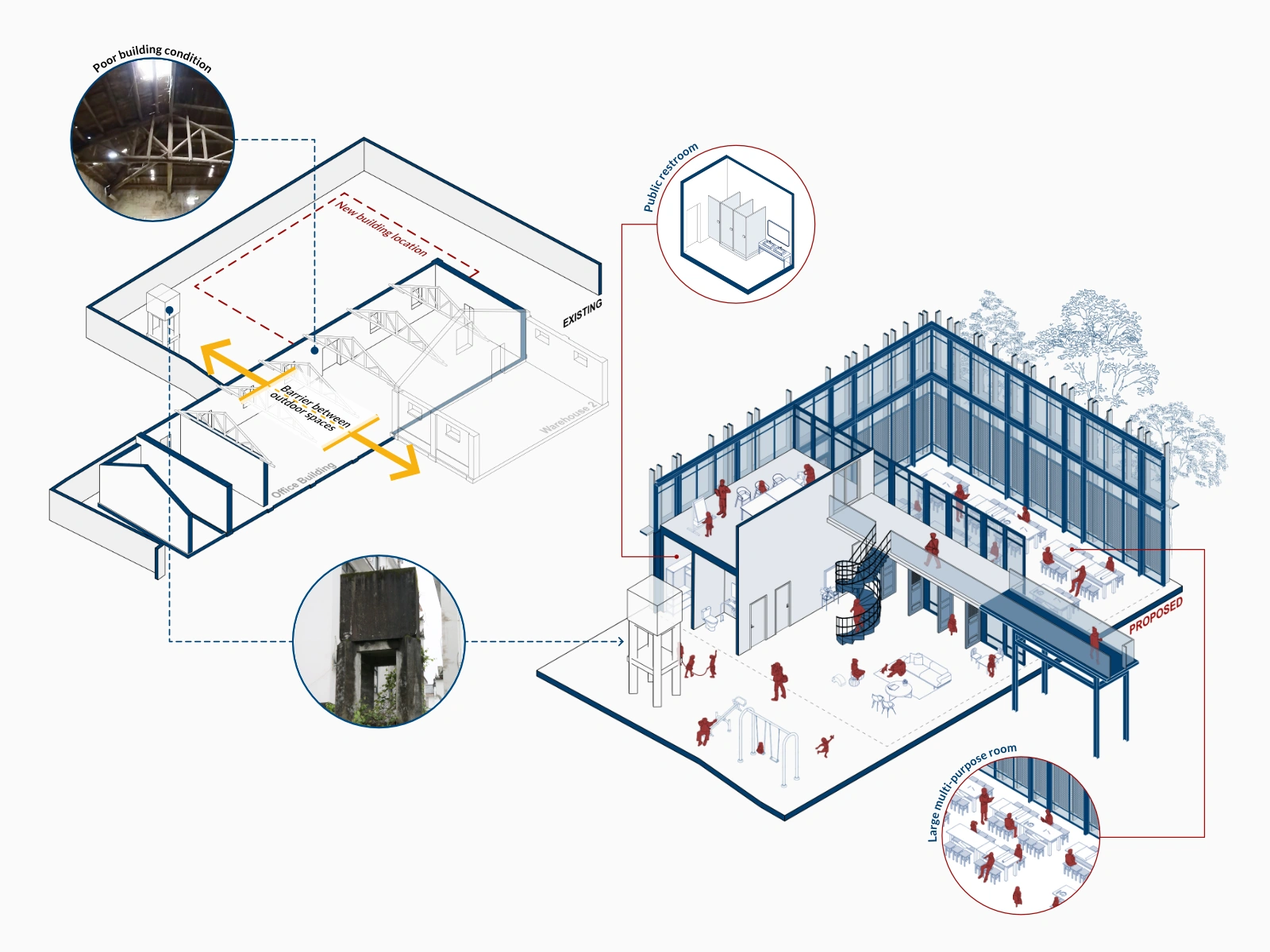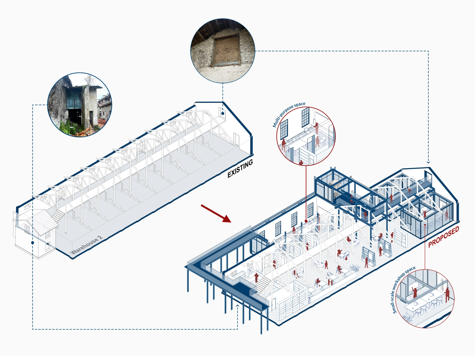 In contrast, Warehouse 1 and the office building are removed due to their structural limitations, low reuse potential, and spatial constraints.