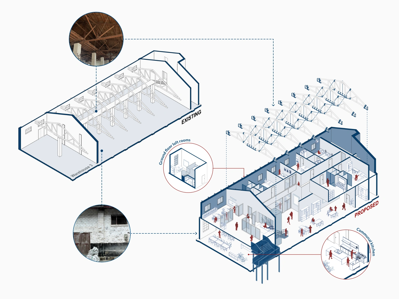 The assessment also led to the decision to retain two key buildings: Warehouse 2, for its distinctive architectural features; and Warehouse 3, for its functional layout and spatial relationship with Warehouse 2.