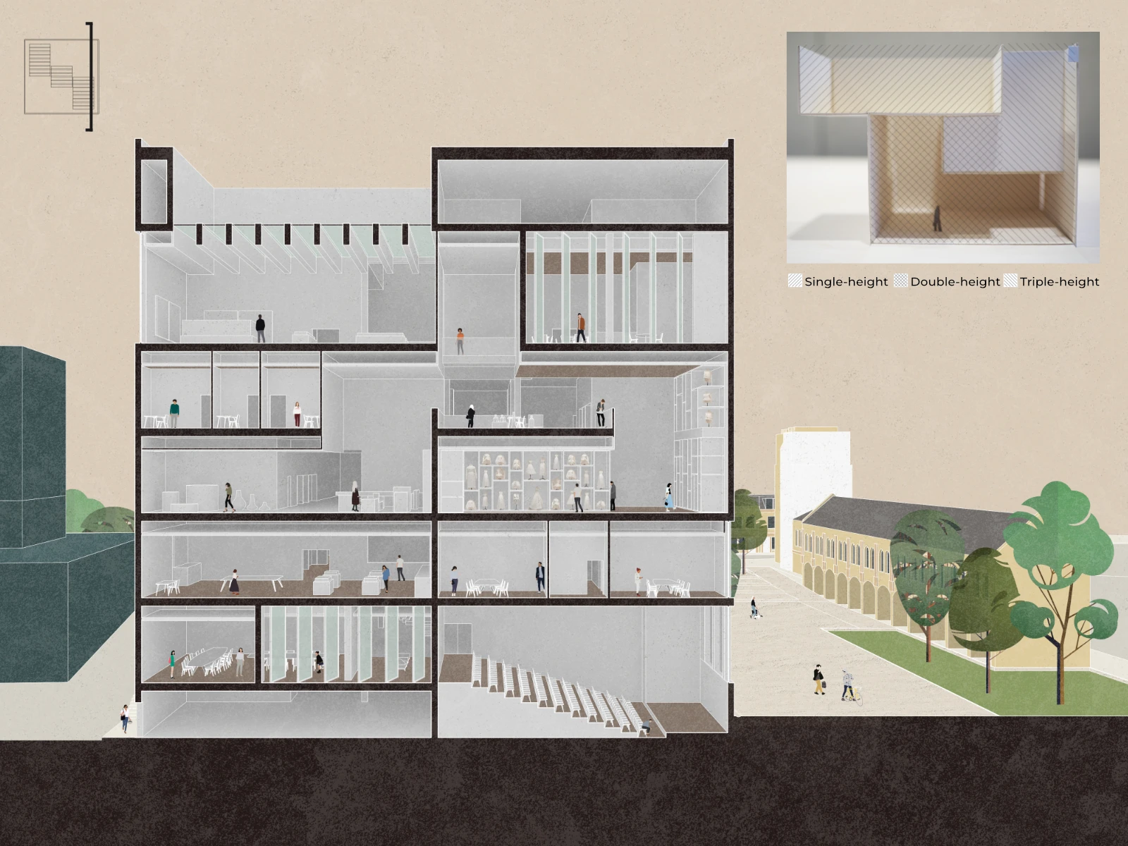 Given the diverse nature of the collections, the spatial study focused on both the sequencing of displays and the specific spatial requirements of each exhibition.